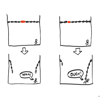 In the simplest case, leak-before-failure is like deliberately designing a chain with a calibrated amount of non-uniformity in the links, to control where the weakest link lies,. You can imagine, for instance, a chain with one link being structurally weaker than the rest, so it is the first to break under tensile stress (possibly in a way that decouples the two ends of the chain in a safe way as illustrated below).