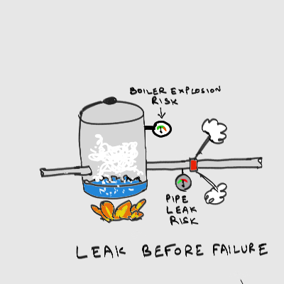 So for example, if pressure in a pipe gets too high, a valve should fail, and alert you to the fact that something is making pressure rise above the normal range, allowing you to figure it out and fix it before it gets so high that a boiler explosion scenario is triggered. Unlike canary-in-the-coalmine systems or fault monitoring/recovery systems, leak-before-failure systems have failure robustnesses designed organically into operating components, rather than being bolted on in the form of failure management systems.