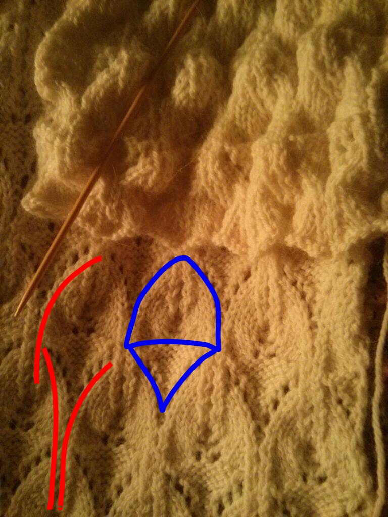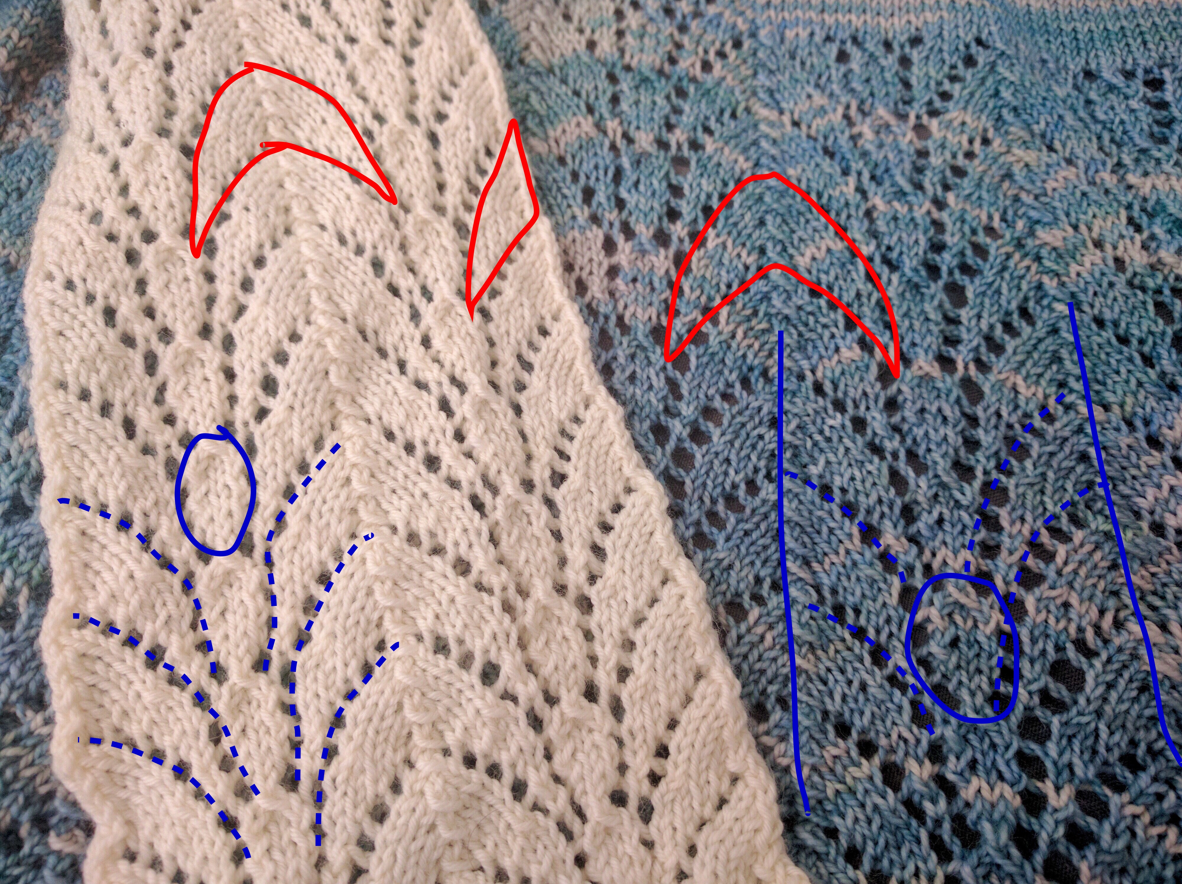 Fountain Lace is the simplest lace here, composed of only four pattern rows. Its figural "fountains" made of holes interlock with boomerang shapes made by the ground stitches: