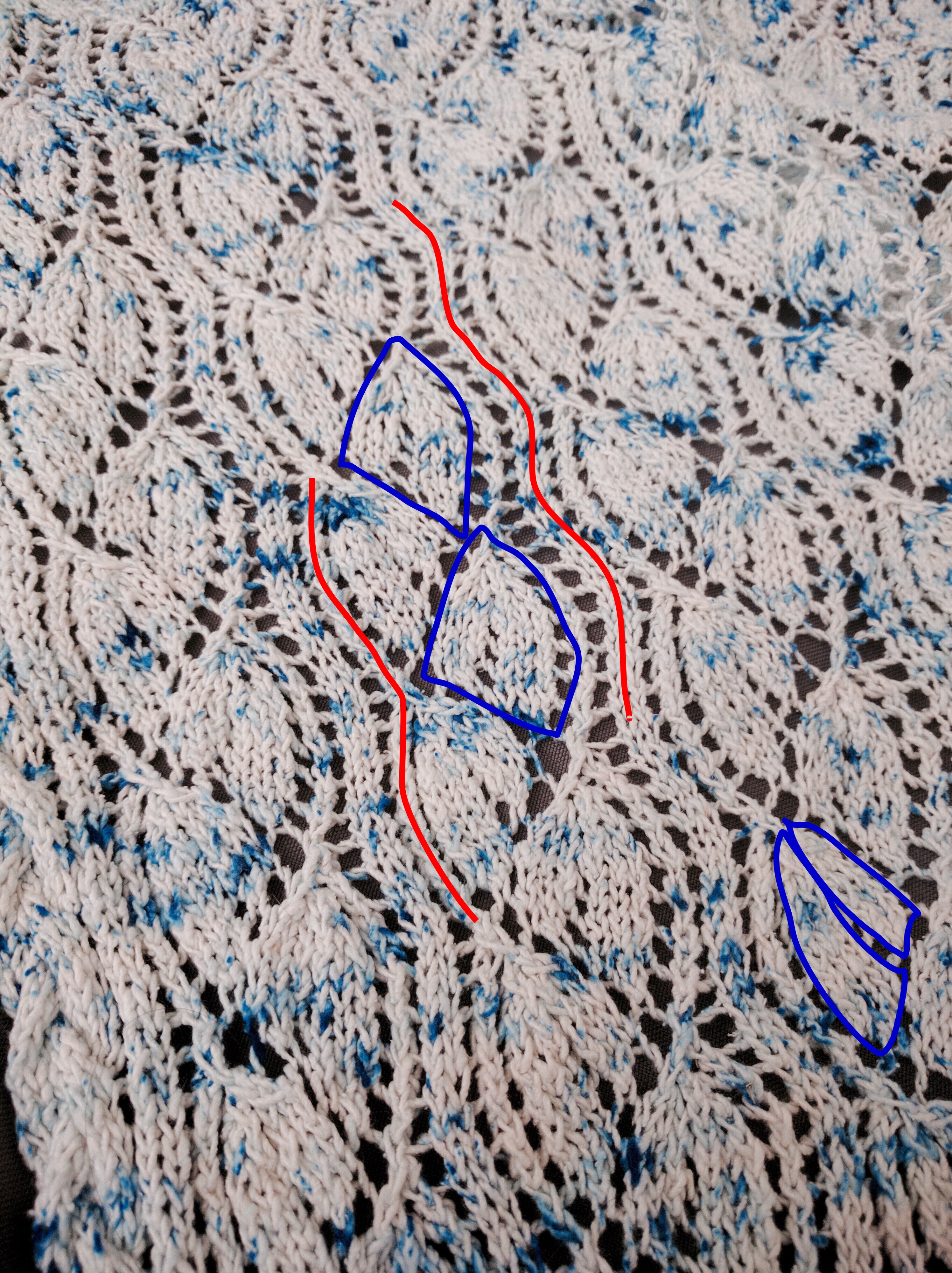 The half-drop principle in lace knitting is frequently used to create figure-ground tessellations. In many patterns, you alternate knitting bottom halves and top halves of motifs, then reverse the pattern and knit the tops on the bottoms and new bottoms on the tops. An example is Oriel Pattern, composed of many interlocking centers and local symmetries: