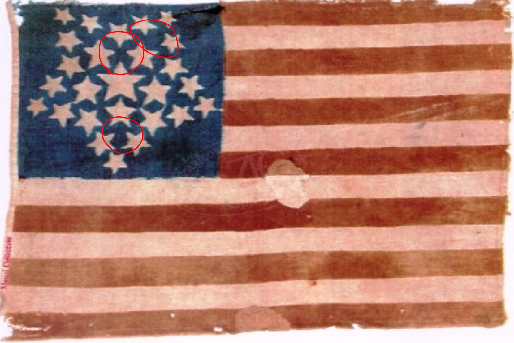 Instead of the rather banal pattern we are used to, this old flag uses different-sized stars and arranges them in order to create locally symmetric background spaces with strong shape (circled). Old flags have much more roughness than industrially produced flags; the creators of the old flags were capable of making perfectly linear stripes and evenly spaced stars, but did not put their effort into this kind of precision, preferring instead to focus on achieving forms in harmony with each other.
