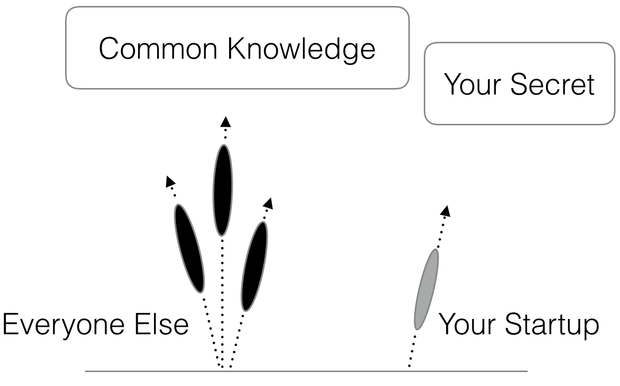 The same ingredients are at work in developing a startup's strategy, except the output is a secret. The secret can be in the form of a unique customer niche (Tesla's high end electric vehicle buyers), a novel product implementation (Google's PageRank), or a go-to-market strategy (Facebook's initial university focus).
