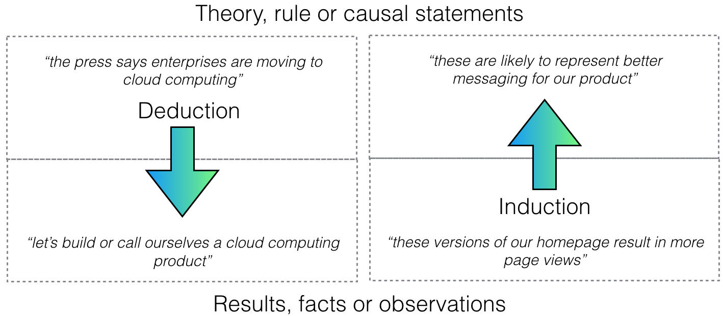 "So when thinking about what kind of company to build, there are two distinct questions to ask: What secrets is nature not telling you? What secrets are people not telling you?" -Peter Thiel, Zero to OneFounding your startup on a secret that emerges from this type of intuitive knowledge can be risky. By their nature, secrets aren't going to have validating infrastructure behind them to make their truth apparent. The choice to believe in a secret is not a black-and-white ordeal, and feels more like an oscillation between believing in a conspiracy theory and doubt. While secrets give us a much better chance at starting a successful company, they require a leap of faith and are not guaranteed. The Three Kinds of Logical Reasoning We can give this leap of faith a much stronger chance by supporting it with established techniques in logical reasoning. Most everyone has heard of deduction and induction. Simply: deduction is when you take a valid theory and apply it to a specific case. Induction is when you take a specific case and generate possible theories.