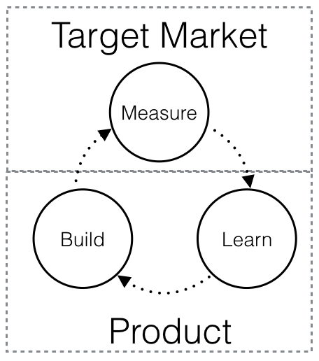The BML cycle from The Lean Startup. Note that the frame is already bounded and determined: there is a clear box for the Target Market and Company.