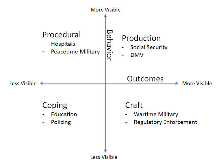 Organizations, like individuals, have personalities. Like personalities, they are a function of the environment and temperament, and there are many ways to categorize them, but Wilson suggests a useful 2x2 that explains something I’ve kept coming back to. He notes 2 critical questions for managing an organization; “Can the activities of their operators be observed? Can the results of those activities be observed?” In that vein, he gives examples of government bureaucracies that fall into each category — and his examples are worth the while to examine, but he’s already done that well.