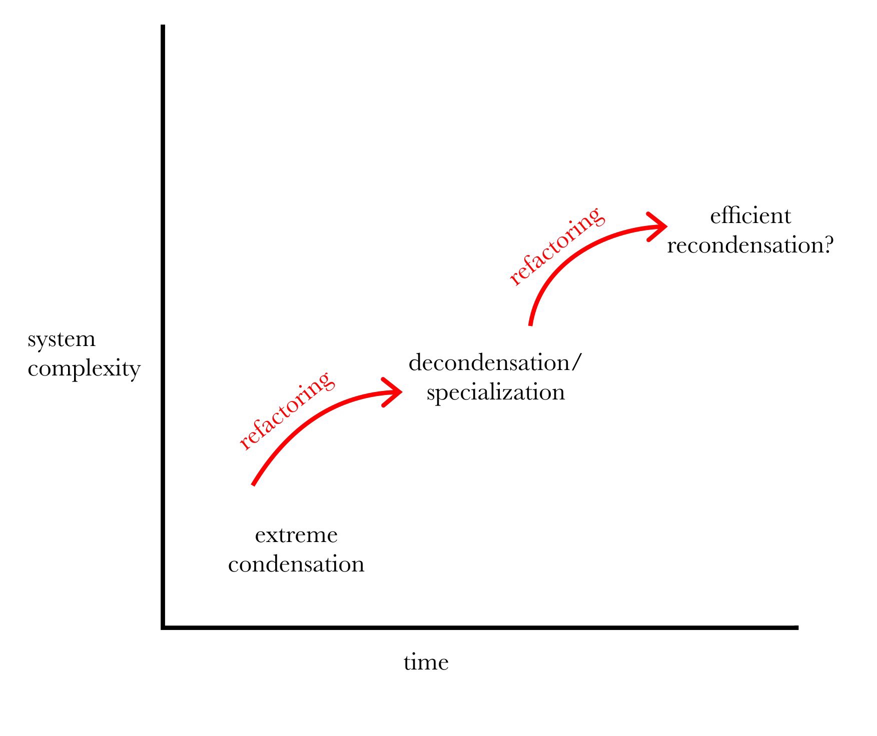 Unbundling – Elements formerly only available as part of a unitary object are now sold separately, like nutritional supplements instead of food. Those who only want the competence porn aspect of science fiction (without, say, the romance or character development) can get it from The Martian.Food was probably the first domain of de-condensation. In early prehistory, a technological revolution (cooking, and a more varied diet) abstracted nutrition away from the past order, which involved sitting around chewing for ten hours a day. The change disrupted not only our behavior, but our bodies; our saliva, mouth, teeth, and gut adapted to this change. And agriculture changed everything all over again. Only recently, after yet more technological revolutions (abstracting fertilizer into constituent chemicals, abstracting micronutrients from food), have humans overcome the stunting and nutritional deficiencies that became common after the agricultural de-condensation event. Refactoring at a minimum de-condenses a concept in a new way. At its best, it re-condenses the mess it makes into a new whole. The Sacred Wholeness Many of us moderns have a wistful feeling for the simpler, more condensed order of the (imagined) past. We might not want to be subsistence farmers, but a cast iron pot over the fire, in a rustic cabin in the snow, evokes a longing. Our own objects do not seem so dense with meaning. Each time we become aware of bad fit in the world - traffic, getting sore from sitting in a chair too long, a moment of loneliness, a software malfunction - we are tempted to nod along with the Unabomber that industrialization was a mistake. So we can understand, a little bit, why technological change triggers a sacredness immune response. Technology threatens the fragile order with which humans orient themselves. Technology threatens to tear the fabric of society, and even to carve up humans themselves into separate functions. Previous structures of meaning may not survive. Technological de-condensation is a kind of logical analysis, and logical analysis is very impolite in sacred matters. Technology breaks down unified structures and demonstrates that they are partible. Christopher Alexander describes a "loss of innocence" when using logical, instead of intuitive (sacredness-respecting), means for design: