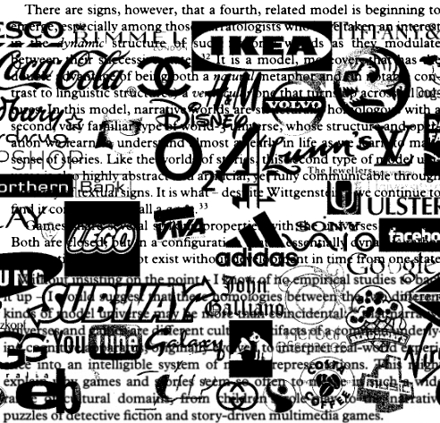 And here is the answer: in order for mess to appear, there must be in the component parts of the mess an implication of extreme order, the kind of highly regular order generally associated with human intention. Flat uniform surfaces and printed text imply, promise, or encode a particular kind of order. In mess, this promise is not kept. The implied order is subverted. Often, as in my mess of text and logos above, the implied order is subverted by other, competing orders.