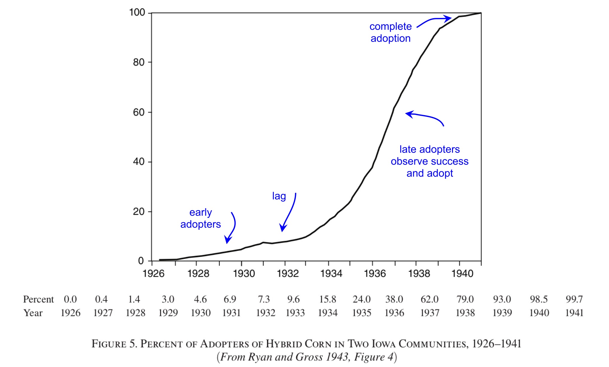 Many authors writing on idea contagion fail to distinguish between contagion from mere exposure (like infectious disease) and contagion through the rational process of learning and adoption. Young distinguishes three models for the spread of innovations:1. Contagion. People adopt when they come in contact with others who have already adopted; that is, innovations spread much like epidemics. 2. Social influence. People adopt when enough other people in the group have adopted; that is, innovations spread by a conformity motive. 3. Social learning. People adopt once they see enough empirical evidence to convince them that the innovation is worth adopting, where the evidence is generated by the outcomes among prior adopters. Individuals may adopt at different times due to differences in their prior beliefs, amount of information gathered, and idiosyncratic costs. Young, p. 1900.Young argues that these forms of innovation diffusion can be distinguished by the shape of the curves of adoption. For instance, the curve formed by social learning is two curves superimposed: first, early adopters try the idea out, and adoption initially accellerates, then decelerates or even decreases as the population of early adopters is exhausted. Then, for successful innovations, a second period of superexponential adoption follows, as the rest of the population observes the idea's success among early adopters. An example is the adoption of hybrid corn among Iowa farmers between 1926 and 1941: [caption id="attachment_5809" align="alignnone" width="500"]