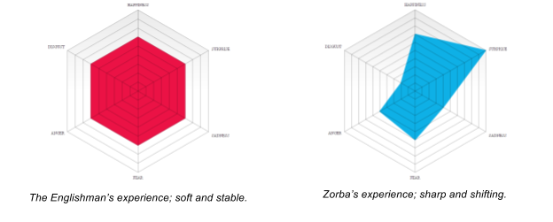 Another way to view the effects of rationality on experience is to consider these two diagrams. They represent a momentary snapshot of Zorba’s and the Englishman’s feelings at any one point in time.