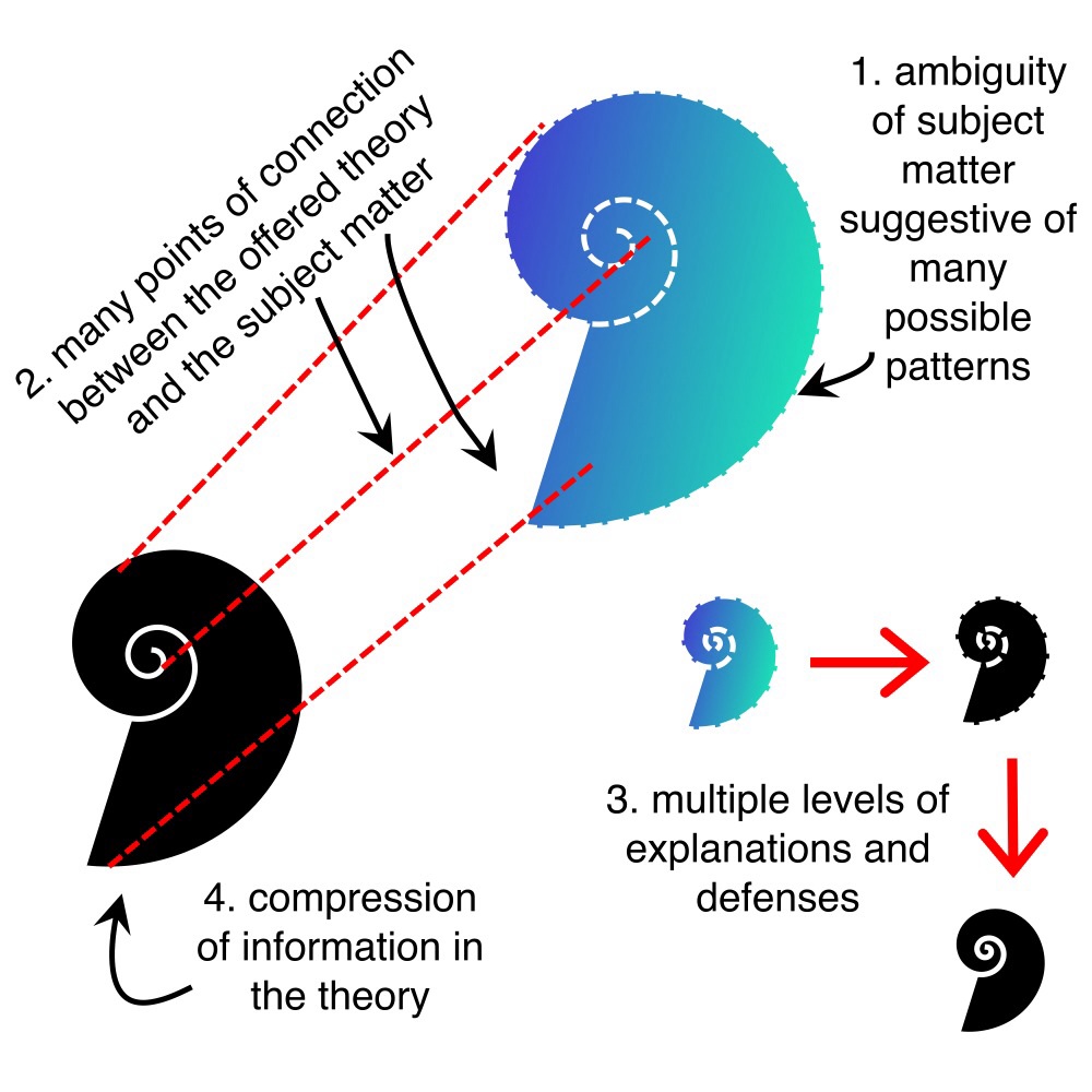 One reason I was attracted to Girard's theory is that it's a bit crackpotty. I have in the past defended an aesthetic analysis of (potentially) crackpot theories - judging them as folklore or art forms. Theories that are good when judged as folklore share some traits with theories that are good when judged for epistemic value. As I noted in Puzzle Theory, theories are felt to be epistemically satisfying explanations (regardless of their truth value) if they share four main characteristics: [caption id="attachment_5898" align="alignnone" width="500"]