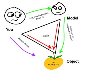 In the beginning, there was copying. Girard proposes that all human desires (excluding instinctual desires) are copied from others. In order to learn, a human needs a model; but as he copies his model, he also copies his model's desires, and in doing so, becomes his model's rival. Desire is triangular: it is a relationship not merely between a desirer and an object, but between an observer, a model, and the model's imagined object of desire. [caption id="attachment_5899" align="alignnone" width="500"]