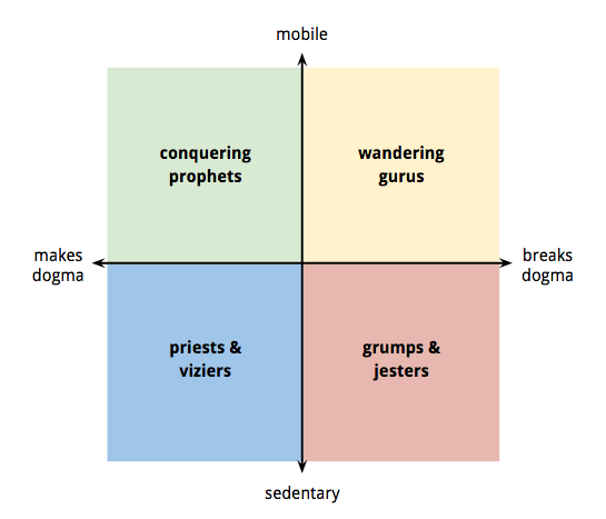 Hmm its a bit of a convoluted post. How did you arrive at this matrix? Why is the operations guy not in the room? How do you map the priest, guru etc... to the strategy, tactics etc.. You only do that at the very end, why not earlier? Why are the axis in this matrix chosen this way... so many interesting ideas but i feel they should be explained better in the post.