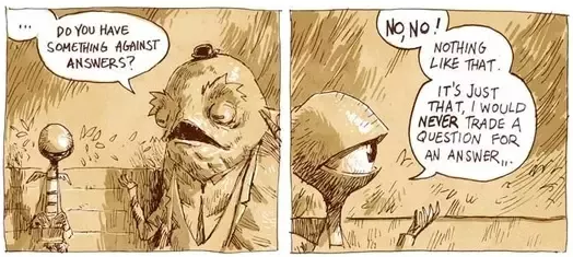 The first of the twelve virtues of rationality is curiosity, which “seeks to annihilate itself; there is no curiosity that does not want an answer.” This may be, but desire comes in many forms, and a good curiosity isn’t hasty about this self-annihilation until it has truly fulfilled its purpose. Curiosities that are overzealous are like interrogations, producing false confessions from the territory. That will get you answers, but it may not get you truth. This often involves stopping when it’s easy. This can be the classic confirmation bias of someone who googles about something and stops with the first result that affirms their existing view. Or someone may swap in an easier question and answer that one instead, then use that as their answer to the first. Kahneman and Tversky documented lots of instances of this, for instance when people who know the high-crime city Detroit is in Michigan, but nonetheless estimate lower total crime rates for Michigan overall than for just “Detroit”, because they swap out “how many crimes occur each year in Michigan?” for “do I associate ‘Michigan’ with ‘crime’?” But there’s a different form, which is questioning the territory (a person or situation) in a way that doesn’t give space for your actual curiosity to be resolved, instead yielding some sort of confusion or simplification that overshadows a still-existing unknown. For instance, someone asking “why do some things move themselves and others not?” may conclude something like “Animals have a life essence, or élan vital, that’s why!” This is a mysterious answer to the question: it feels satisfying but actually just buries the curiosity one level deeper: why do some things have élan vital, and others not? Yet another form yields nothing satisfying at all, in which case the curiosity may retreat in frustration, only to come back even more aggressively in the future. This is common when someone has a legitimate thing they’re trying to understand (eg “why does it feel like nobody likes me?”) but then somewhere between their curiosity and the answer their question gets distorted (becoming perhaps “why does nobody like me?”) and they end up getting responses that miss the point fail to resolve the original unknown (eg “what? I totally like you, and so do other people”). In this example, the person might indeed be temporarily reassured on one level, but they haven’t actually gotten a deep understanding that can help them if the original question comes up again. So when it does, it can be even stronger for having felt ignored or misunderstood. This is an oscillating tension, of the kind that Robert Fritz talks about and contrasts with creative tensions. “A basic principle found throughout human nature is this: Tension seeks resolution.” Effectively working with curiosity involves being able relax yourself while experiencing a tension of not-knowing, without insisting on immediate resolution. Some questions can be easily answered, but many will take time and non-obvious exploration. This means letting the problem solve you, rather than you solving the problem; letting the question ask you, rather than you asking the question.Hold your Questions