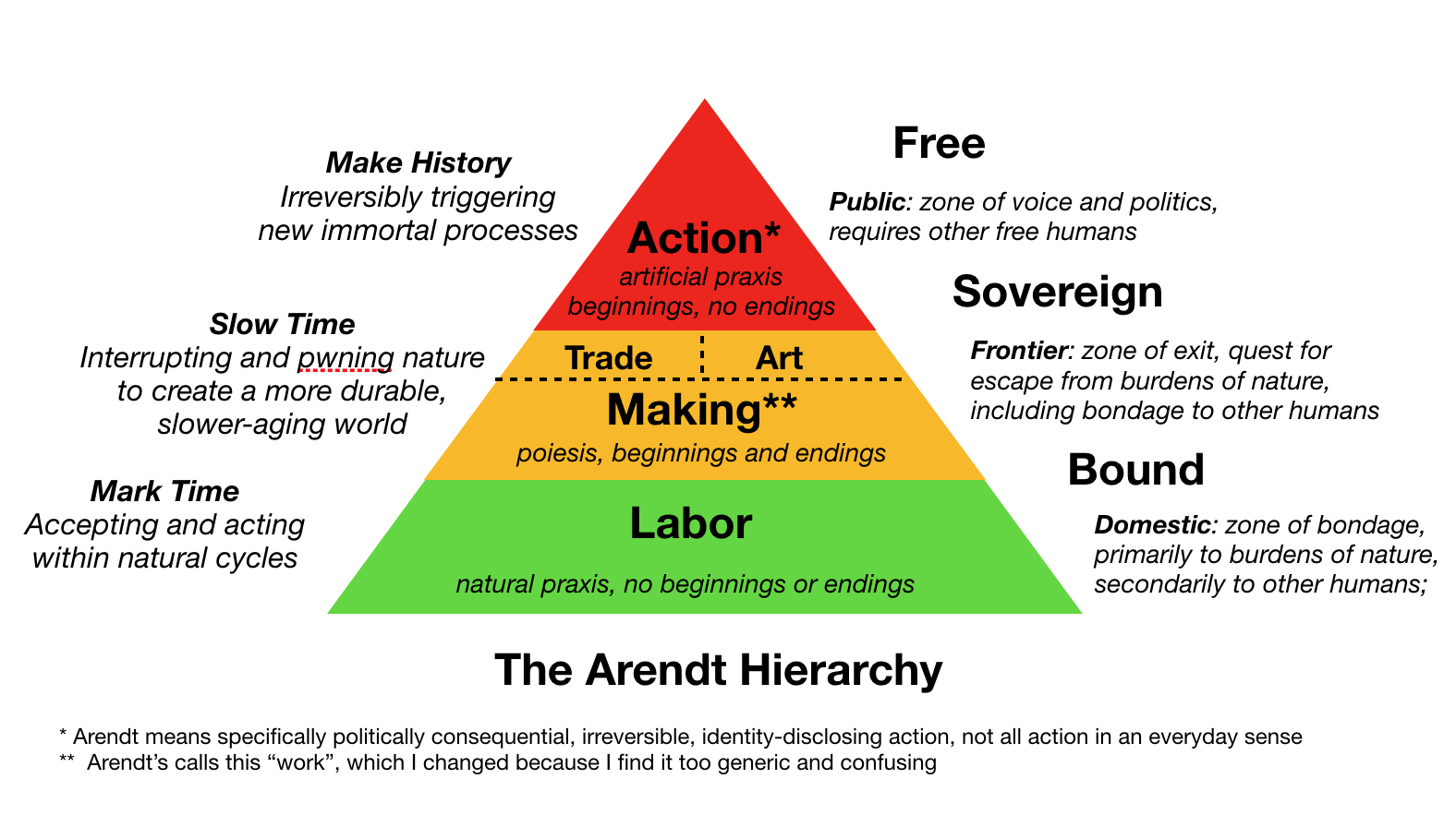 A mnemonic to remember the distinctions is mark time or make history. In everything you do, from posting a tweet or buying a coffee to running for President or tackling the Riemann hypothesis, you must choose between two extreme contexts: to either mark time with labor, or make history with action. In between there is a third context, where you can choose to slow time, which includes any sort of making, including art and trade (which is making in the sense of market-making). Naturally, Arendt thought (as do I) that you must choose action and history-making as much as possible. That is what it means to be fully human.