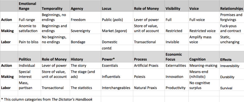 At the top of the pyramid, we have what Arendt considered full-featured humans, enjoying the highest level of agency possible: making history. The locus of action is the public. If labor is about blending into the processes of nature, and making about interrupting and slowing it to create a durable world, action is about free behaviors that make history. Arendt uses the terms poiesis and praxis in somewhat ambiguous ways, so I use the term artificial praxis for the process quality of action. It incorporates the artificial because it plays out in the durable world built by makers (and therefore implicitly incorporates maker-poiesis), but it derives its situatedness (which is what marks it as a kind of praxis) neither from the cycles of nature, nor from the affordances of a durable world, but from the presence of other free minds. To act is to act on other free minds (which have equal agency and can therefore respond unpredictably). The calculus of action is the calculus of processing the unpredictability of free humans. Transgressions, promises, and forgiveness constitute the stuff of action. Money, in the context of action, is primarily an instrument of power. Its textbook "uses" -- as means of exchange, store of value, and unit of account -- have no direct salience to action. In a sense, making is defined by money, and laboring is confined by it, but action is outside of it. As Francis Underwood laments in House of Cards, "Such a waste of talent. He chose money over power. In this town, a mistake nearly everyone makes. Money is the McMansion in Sarasota that starts falling apart after 10 years. Power is the old stone building that stands for centuries. I cannot respect someone who doesn't see the difference." The metaphor is a bad one in Arendt's terms though. Both old stone building and McMansions, by virtue of being comparable in terms of the durability of stuff, belong within the calculus of money. To exercise power in Arendt terms is to see the difference between buildings and people. To act is to begin something without the possibility of meaningful reversal. Do-overs and reworkings are for laboring and making. But you cannot predict or control what happens after you act. Means-ends reasoning fails as a cognitive mode because other free humans are in the loop. You cannot science the shit out of action the way makers can, or game theorize the freedom of others out of the equation as you can with incentives in markets peopled by curiously behaviorist econs chasing utils. You are also not bound to others in unalterable ways the way labor is. The reward for accepting unpredictability is meaning. Unlike the abyss faced by makers, the plurality of other humans who are the object of action don't just stare back. Sometimes they accept your invitation to play on; they join you in continuing the game. To act, in the Arendt sense, is to issue a call to play an infinite game in the James Carse sense (Carsean finite games, obviously, map to maker-theaters). The reward for dealing with others through promises and forgiveness, rather than fuck-yous, is freedom, a richer mode of being than sovereignty. Where laboring does not seek immortality beyond reincorporation into broader natural cycles (ashes to ashes, dust to dust), and making accepts durability (in the case of the human body, longevity) as a substitute, action has the potential for immortality because it has a shot at triggering an infinite game. Because action begins new processes and relies on the actions of other free humans for unpredictable perpetuation, it can potentially trigger generative patterns of events whose course is not tied to the durability of the world. Instead it is tied to the free choices other free humans make about what is worth perpetuating in some form. Action makes history not because it seeks to, but because it is the inevitable consequence of an exercise of freedom. Action fully discloses the actor because unique identities are integral to how it unfolds. Combining Arendt and Carse, you could say that history is merely the set of all infinite game moves so far (a slight generalization of the last definition of history I offered: as everything that has been forgiven so far). Here's a table summarizing some of the essential features of the three modes of being and doing.