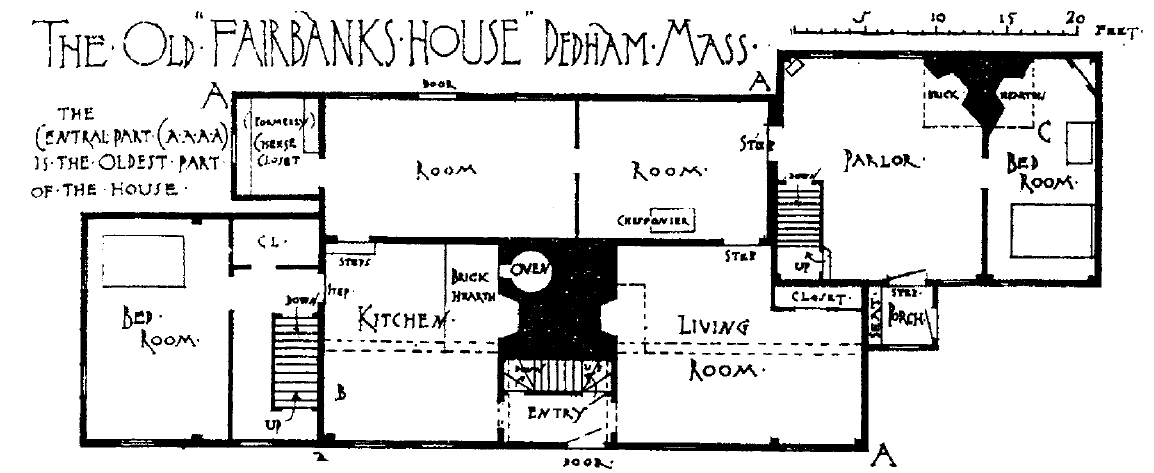 Floor plan of the Fairbanks House in Dedham, Massachusetts, published in The American Architect and Building News, Volume X, 1881.[/caption]