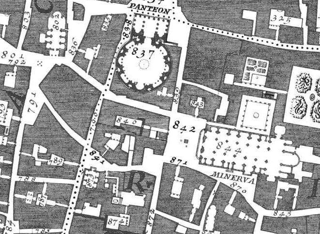 What one chooses to hide beneath poche is strategic: a floor plan drawn for an engineer would likely conceal fewer of its ancillary functional spaces beneath poche than one created to present to a client or an outside audience. Nolli's 1748 map of Rome blacked out everything except for areas of space accessible to the public, regardless of whether they existed inside or outside the obfuscated boundaries of individual buildings.