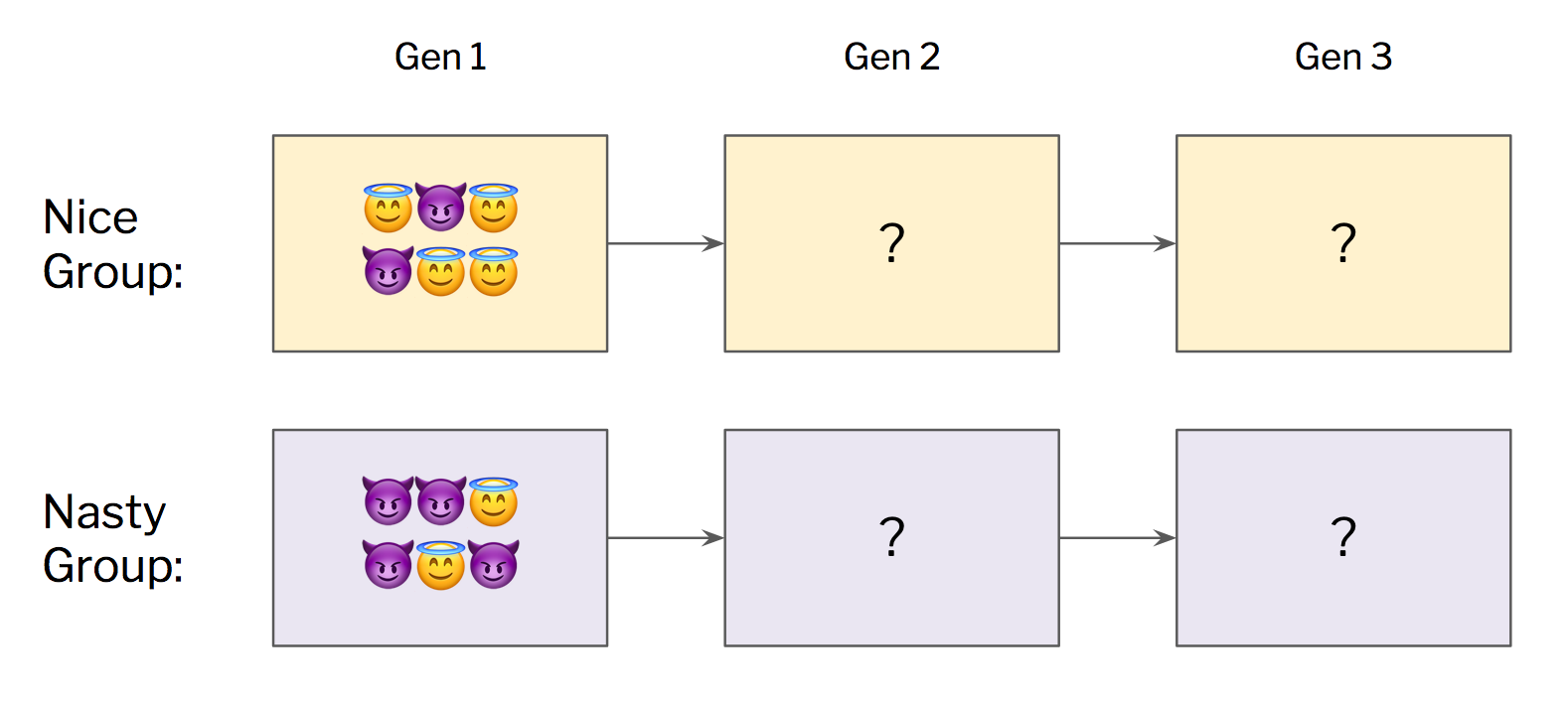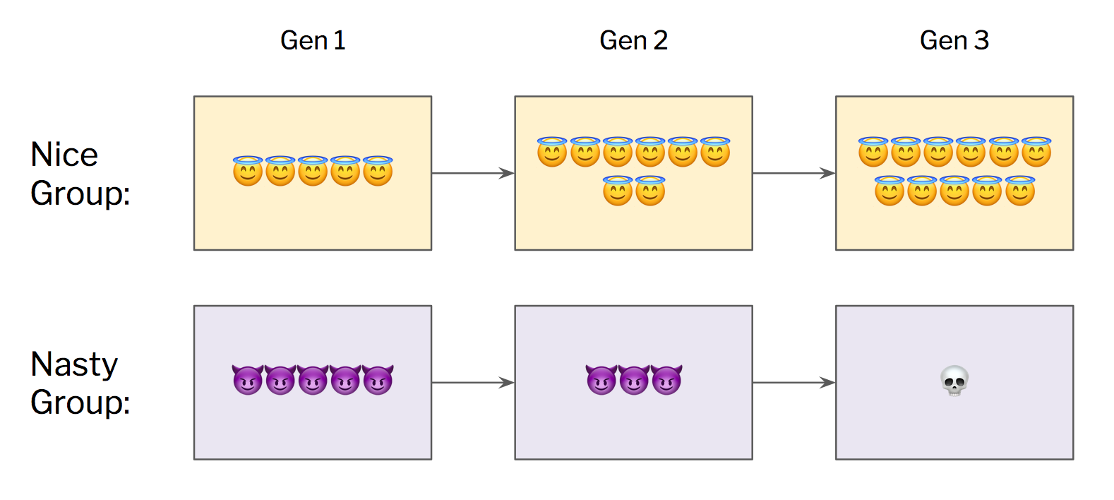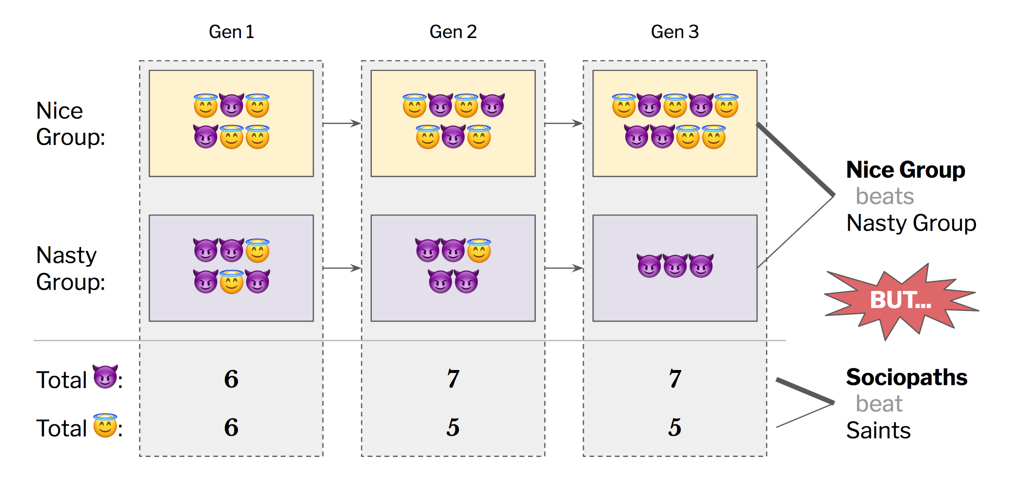On a group level, we can reasonably expect the Nice Group to fare better, since it has a higher proportion of saints. But within each group, saints will lose to sociopaths. So the proportion of saints in the overall population will typically fall over time: