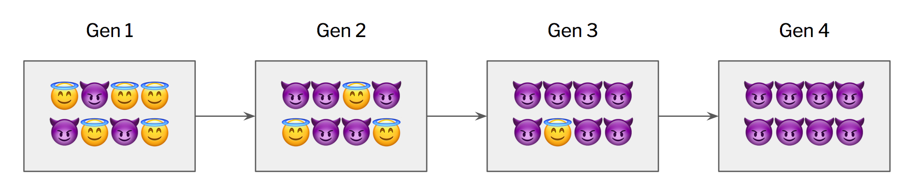 Sounds great, right? This seems to give us exactly what we want: instincts to help others (well, fellow group members at least), self-interest be damned. In practice, however, there’s almost never such a pure matchup: 100% Saints vs. 100% Sociopaths. Everything is always more mixed, meaning that group selection and individual selection operate simultaneously. And, unfortunately, individual selection tends to work much faster and exert stronger evolutionary pressures than group selection, quickly eroding whatever altruism might otherwise be able to evolve.