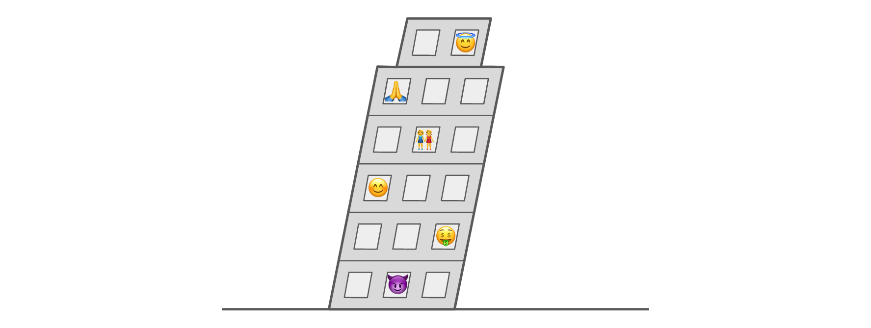 The tower represents our capacity for moral behavior. Lower levels are more base; higher levels, more virtuous. We don’t need an exact floorplan, but here’s the kind of thing I’m imagining: