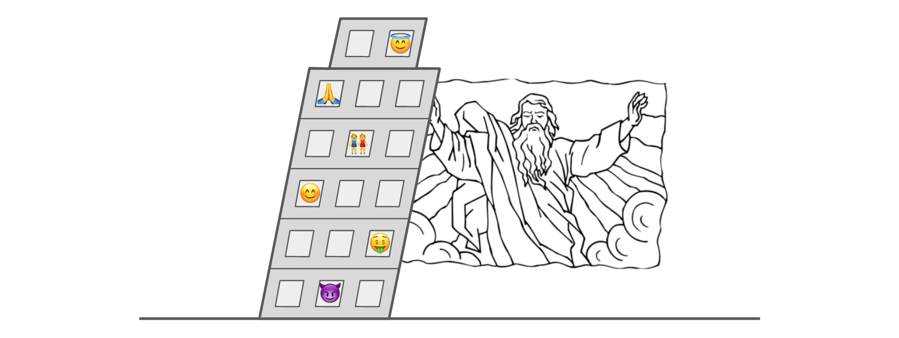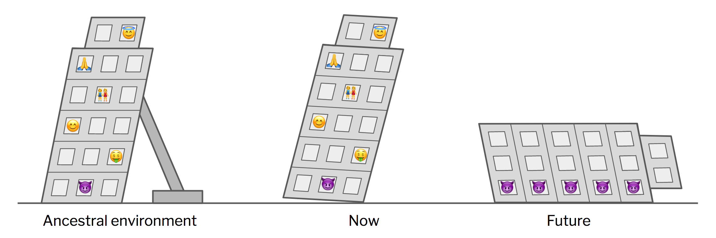 Don’t hate the player, hate the game. — Ice-T Game theory is asleep, cooperate for no reason. — Deity of ReligionThere’s an image that’s taken root in my mind recently that I can’t seem to shake. I picture humanity living in a large, rickety tower, tilting at a precarious angle to the ground — like so: