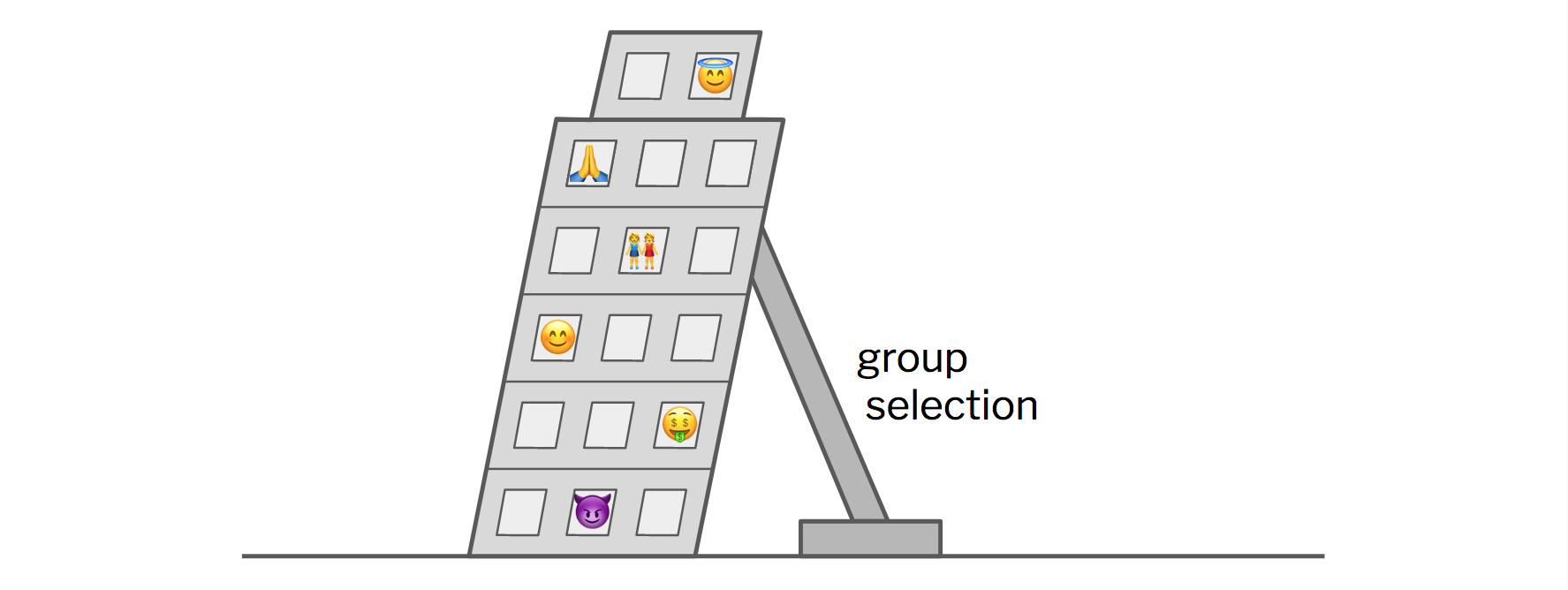 A second answer to our question — what supports the tower of morality? — is natural selection. Specifically, individual selection. This is the Darwinian mechanism we all learned in high school: good old survival (and reproduction) of the fittest. The idea is that some individuals have more useful traits than others, and thereby live longer and pass more of their genes along to the next generation.