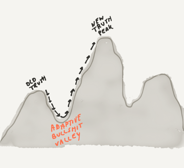 Maybe, a perfect world would not be a world without bullshit, but rather one where there is just the right amount of it. Maybe, to reach higher peaks of truth we sometimes need to descend into bullshit valleys. Traverse a knowledge fitness landscape, in other words, where bullshit can be adaptive.