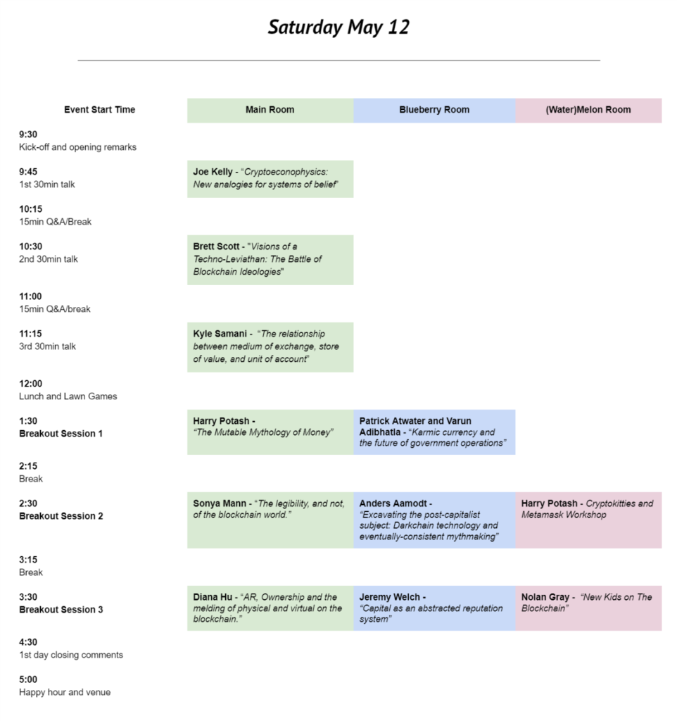 Vinay Gupta Bio: Vinay is a co-founder of the Ethereum project and CEO of Mattereum. Venkatesh Rao “BloodCoin” Bio: Venkat is a Seattle-based independent management consultant, writer and proprietor of Ribbonfarm.com. He is the author of The Gervais Principle, Breaking Smart and Tempo. Abstract: Our economic system is based on the future prospects of societies, captured in the idea of sovereign bonds. What if we could reimagine economics based on the past? Ideas like blood debts have been part of economic relationships in the past. Could we model an entire socioeconomic history of vendettas, transgressions, reparations and such on a blockchain, and use it as the basis of the financial instruments needed in an economy? In this talk, I will explore a bit of design fiction in the form of a speculative blockchain concept called "blood coin" that attempts to explore this concept Kyle Samani “The relationship between medium of exchange, store of value, and unit of account” Bio: Kyle is the co-founder and managing partner of Multicoin Capital, a hedge fund focusing on blockchain technology. Abstract: There are three commonly acknowledged purposes of money: medium of exchange, store of value, and unit of account. How do these purposes relate to each other? Kyle will look at how these different purposes relate to each other and the emergence of new forms of crypto-money Sonya Mann Bio: Sonya Mann is a reporter with Inc. covering the business side of technology, with a focus on enterprise companies, the sharing economy, and marketplaces that empower informal entrepreneurship. Matilda Wysocki Bio: Matilda studies how different aspects of the world are connected, and how they may be reconnected for the better. They feel most fulfilled as a community organizer, having organized around homeless rights, access to education, climate justice, and disability rights, but have a creative practice incorporating programming, art, and design into their pursuit of the above goal. Abstract: Blockchains allow for the possibility of distributed communal control over the shared narratives that mobilize communities, and the divergent ones that are pushed to the margins only to redefine social movements (e.g trans women and women of color being ignored in 2nd wave feminism, only to become integral to 3rd wave feminism).This talk will discuss how we can embrace a floodgate of previously unheard voices as our power structures decentralize more and more, how we can feel supported even as our traditional communal support structures (families, cities, nations) become more nebulous, and how the alienation that comes with unsatisfactory networks (e.g unknown Twitter followers) can make way for a deep sense of Beloved Community.