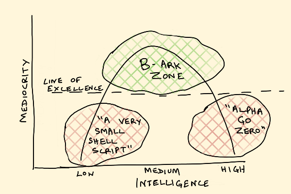 There's one last major wrinkle in our portrait of mediocrity. Remember Douglas Adams' story of the Golgafrinchans Ark B? To refresh your memory, the Golgafrinchans got sick of the mediocre people in their midst: "telephone sanitisers, account executives, hairdressers, tired TV producers, insurance salesmen, personnel officers, security guards, public relations executives and management consultants." So they convinced these mediocrities that some sort of doomsday was looming and that they had to get off the planet in a big spaceship, the B Ark. The B-Arkers were assured that the rest would follow in the A and C arks. The A Ark would contain all the excellent people, Golgafrinchans at their best: scientists, artists and such. And the C Ark would contain all the people that did the actual work. Of course, the supposed A and C Ark people never left. They thought they were being clever, getting rid of an entire mediocre, useless third of their population, but in an ironic twist, they are wiped out by a disease that spread through unsanitary telephones. So as it turned out, only the B Ark people actually survived. A case of survival of the mediocre. In the fictional universe of the Hitchhiker's Guide to the Galaxy, we humans are descended from the B Ark people, who ended up on Earth via some complicated plot twists. What is interesting though, is Douglas Adams' enumeration of B-Ark types, which gets at a key feature of mediocrity. There is a difference between what I call soft and hard mediocrity, and most of Adams' examples are hard-mediocre. Soft mediocrity is mediocrity revealed through middling performance in domains where A-Ark excellence is actually possible on one end of the performance spectrum, and error-free correct, reliable C-Ark useful performance is possible at the other. So a mediocre chess player, or a sloppy assembly line worker both exhibit soft mediocrity, because both excellence and error-free play are achievable and meaningful. Hard mediocrity, on the other hand, is performance in domains that are just so open and messy, there is no prevailing notion of excellence or correct, automatable low-end performance at all. Not surprisingly, hard mediocrity characterizes domains David Graeber characterized as "bullshit jobs." There is only one way to be a telephone sanitizer, account executive, or TV producer: a mediocre way. You may be wildly successful and make a lot of money in these domains but it has little to do with meeting clear standards of excellence or error-free functioning. You may even pursue some sort of Zen-like ideal of unacknowledged excellence, but that will seem arbitrary and even eccentric. The point of these jobs is mostly optionality. Mediocrity is the rational performance standard in such domains. These domains do not fundamentally support a native spectrum of performance where excellence is really meaningful, because nobody really cares enough, and because the boundaries are too messy. Because here's the thing: what creates excellence is not that people are good at something, but because people care enough to be good at something. On the other end of the spectrum, what creates repeatable, error-free performance is not that people are good at it, but that the definitions are tight enough that "error" is well-defined, and people care about the errors.Mediocrity as Subversive Agency