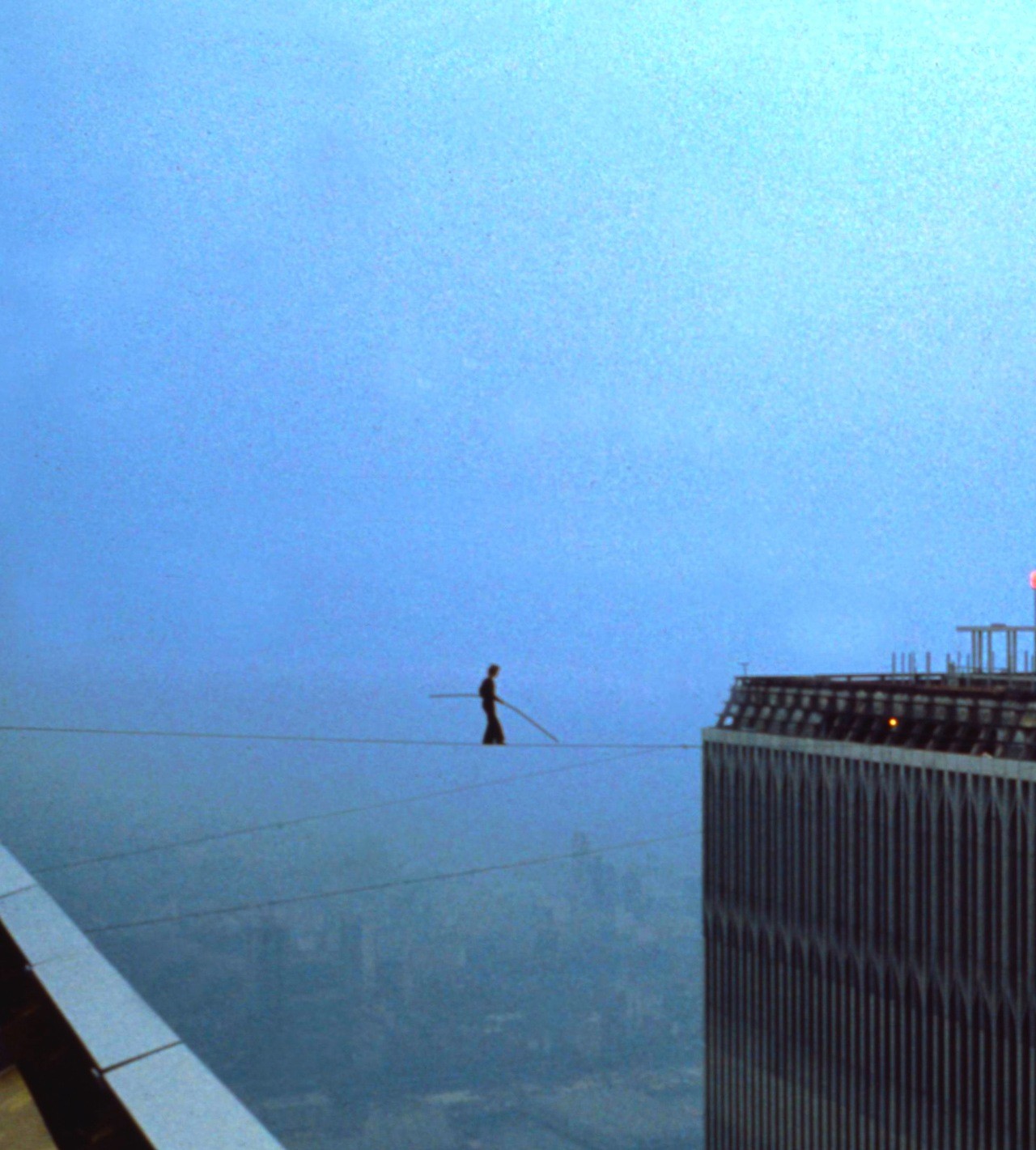 “I promenade from one end of the cable to the other, back and forth. I stare proudly at the unfathomable canyon, my empire. My destiny no longer has me conquering the highest towers in the world, but rather the void they protect. This cannot be measured.”For Petit, it turned out that the Towers and the impossibility of the task he gave himself were just a gateway to contact with something else. They were a way to communicate with the void, to extinguish the self and so see death as clearly as any mortal can. Of course, the experience was ephemeral. A dim recall of the meeting will be carried forever in his mind, but it will only ever be a memory, a poor imitation. Petit knows that: