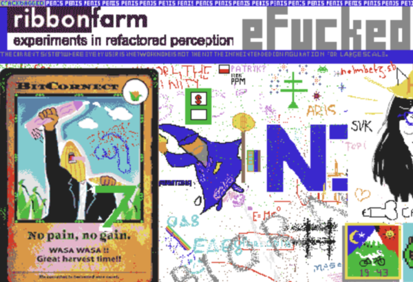 A pack is a small, evolving patch of embodied social reality, such as a group of people riding an escalator. Socially, if you zoom out a bit, the world is a patchwork quilt of live, evolving pack realities that do not cohere particularly well. Moving across the patchwork involves crossing pack experience boundaries, which we experience as varying amounts of friction. If you zoom out a lot, the patchwork quilt turns into a pixellated matrix of pack realities, every pixel representing the state of an actual or potential pack experience. The whole doesn't necessarily add up to anything coherent. It is important to acknowledge this lack of coherence at scales larger than the pack. We are used to talking about the world as though socially, it is a Coherent Social Thing.™ A Thing that will perhaps Solve Climate Change and Go to Mars. This is a delusional understanding of social reality above the scale of packs, but an occasionally useful one. Beyond pack scale, there are coherent bits, mixed up and glitchy mashups of conflicting coherent ideas of a Coherent Social Thing,™ but the thing in itself is, strictly speaking, a mess. Here, for instance, is a snapshot from an experiment conducted recently called Satoshi's Place (inspired by an earlier, non-blockchain experiment called r/place), where people could pay small amounts of bitcoin to help craft a piece of distributed artwork pixel by pixel (the ribbonfarm logo, put up there by Artem, briefly managed to survive in the glitchy Hobbesian mess). The point is, the Coherent Social Thing™ that is supposed to solve climate change or get to Mars looks sort of like this.