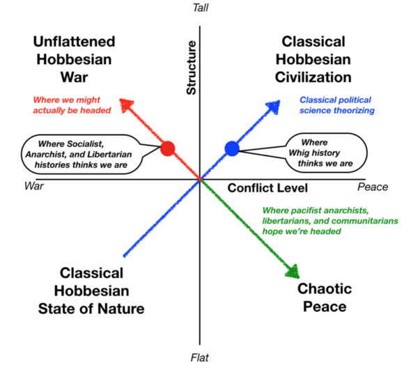 Pacifist anarchists (as well as various kinds of libertarians and communitarians) fantasize about varieties of flat peace emerging out of a collapsing unsustainable state of tall war.
