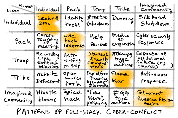 An unflattened Hobbesian conflict is a state of generative violence, where the structure continues to evolve into greater complexity, but violence simply takes on ever newer and more diverse forms, reaching towards the ultimate state of nature: true evolutionary Darwinian conflict. This outcome is not necessary, but it is not impossible. Why? It takes a moment to see this, but the whole Hobbesian model rests on the robustness of a distinction between natural and artificial environments. So long as we can claim that nature is subtle, resilient, and complex, while technology is crude, fragile, and simple, we can argue that the two kinds of environment will evolve differently in response to human actions. When that distinction vanishes, the classical Hobbesian model fails. This is what is happening today. Actions that can destroy civilization can generally destroy nature too. Actions that do not threaten nature do not threaten civilization either. Ironically, it is the very robustness of advanced civilization that makes it more conflict prone beyond a point of late evolution. A sufficiently advanced civilization, noted Karl Schroeder, is indistinguishable from nature. If that's the case, then technological advancement can (and I believe, does), lead to a decoupling between artificial structure and conflict level, and simultaneously, an erasure of boundaries between the natural and artificial. Here's a way to understand this: civilization switches sides. The evolved societal structure and built environment that we thought of as playing on the human "side" in a war with the forces of "nature" switches sides. Nature and the structures of civilization ally with each other, blend together, and present a wholly new kind of formidable survival environment. We thought the world needed to collapse before nature could reclaim it. Turns out, it just needed to get sophisticated enough. Ashes to ashes, dust to dust, evolved complexity to evolved complexity. We may start the game of civilization, but nature finishes it, by absorbing the built environment once the impedance mismatch between the subtlety of nature and the crudeness of technology vanishes, as is happening now. This leads to a rewilding of homo sapiens into what I've been calling a cyber-paleo species, with everything that implies. So we could say that a new state of nature is emerging. One in which biological and artificial realities combine into a intertwingled, stable, regenerative landscape which cannot guarantee peace for the smug creatures that created it. The more advanced the technology, the more unflattened patterns of conflict can continue indefinitely without threatening the stack itself. With software eating the world, this becomes even easier, since continuous cyber-conflict can be conducted with low damage to physical built environments, but high damage to psyches and well-being. Here is my matrix of cyber-conflict examples.