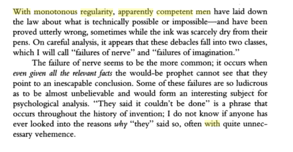 The Aionic being ponders timeless problems. How do we find happiness? How do we seek truth? What is meaning? Where shall we have lunch? But we just went there last week. The temporal being just puts one foot in front of the next, navigating the inner and outer challenges presented by every intensely inhabited, rhymeless moment. The epic temporal being does the same thing, except for 700 miles, with blisters, without a break, and keeps going. Non-epic temporal beings fall by the wayside, claimed early by Chronos. I've often wondered if I have what it takes to do that kind of epic thing, and I very much doubt it. I have a trait that is a good master and poor slave in Aionic realms but a poor master and good servant in epic times: imagination. It's not perhaps a very good imagination, but it can reliably transport me away from the here-and-now when I need to escape. More importantly, it is not an imagination that likes to play servant. It is very much a master, even if only a mediocre one. Which means it turns into a liability during epic times. I know this because I didn't navigate the last two particularly well, and am not putting up a great showing in this one either. The problem arises because there are no doors to escape through. Imagination as master, under such conditions, simply scares the possessor to death. As a servant though, imagination is much more useful during epic times, and can be helpful in figuring out where to plant the next bloody foot. And the next. And the next. The story of this temporal trudgery only appears repetitive and cyclic from the Aionic perspective. From the epic perspective, each step is a story that requires the injection of imagination. The myth in the myth of Sisyphus is that he is engaged in a repetitive, rhyming task. So it isn't imagination per se that is the cause of the weakness, but the casting of imagination as master under conditions that call for epic total presence. Imagination as Aionic temptation rather than one-bloody-step-ahead pathfinder. It is this sort of imagination-as-master that, instead of helping, actively keeps you from taking one damn step after the next, putting one bloody foot after the next. Instead it freezes you in time and space, and eventually Kairos departs, packing away his scales, as Chronos catches up and taps you on the shoulder. No, this will not do. For temporal times, you need a different master: nerve. A quote from Arthur C. Clarke that I've been sharing a lot lately gets at this.