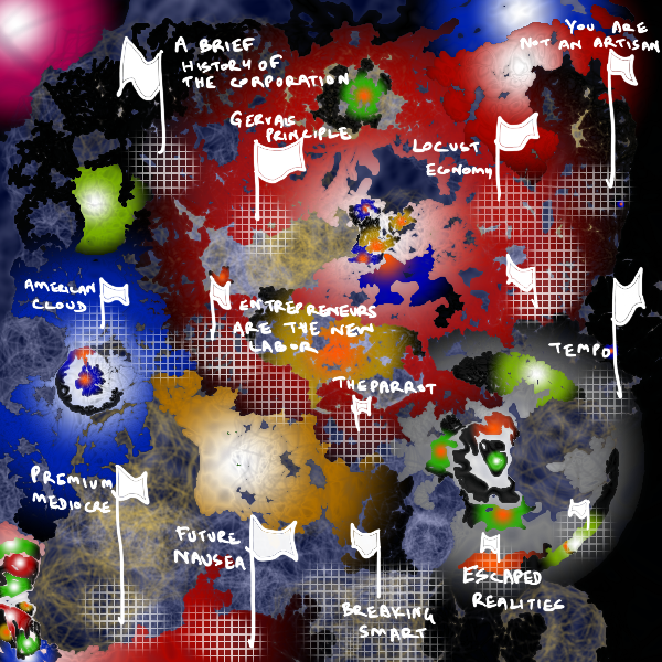 Different but similar problems occur with a "too-large" game, one that unlike the infinite game, is comprehensibly finite (rather than having invisible boundaries that do not act as goals for completion) but still cannot actually be exhausted or completed within the time you have, which can lead to expeditions to particular extreme configurations of the system, defining some problem subset that can be definitively completed within the alloted time. But technically this would exist for any problem space within which you can create some internally justified self-contained subset, and creating particularly personal or externally referential work can be a way to create this kind of enclosure, a constraint that is meaningful to you but still appropriately sized to the remaining possible play time.