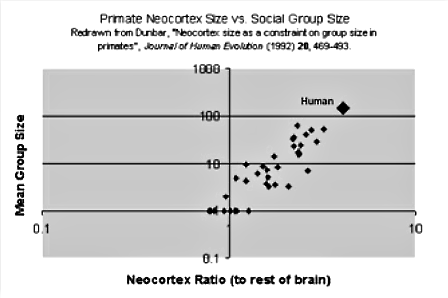 - 150 is often referred to as Dunbar’s number, referring to a number calculated by University of Oxford anthropologist and psychologist Robin Dunbar using a ratio of neocortical volume to total brain volume and mean group size. For more see https://www.newyorker.com/science/maria-konnikova/social-media-affect-math-dunbar-number-friendships. The lower band of 15 was cited in Pankaj Ghemawat’s World 3.0