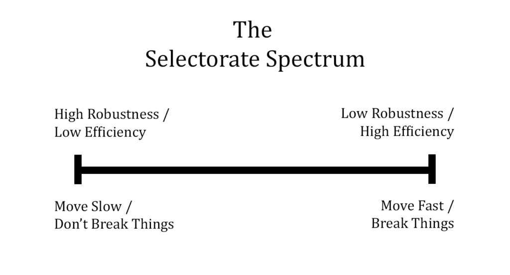 Taken in good faith, these schools represent different beliefs about the ideal point on the Selectorate Spectrum. Keynesians believe that greater efficiency could be gained by giving government officials greater control over monetary policy without sacrificing much robustness. Austrians and monetarists argue the opposite, that any short-term efficiency gains actually create huge risks to the long-term health of the system.