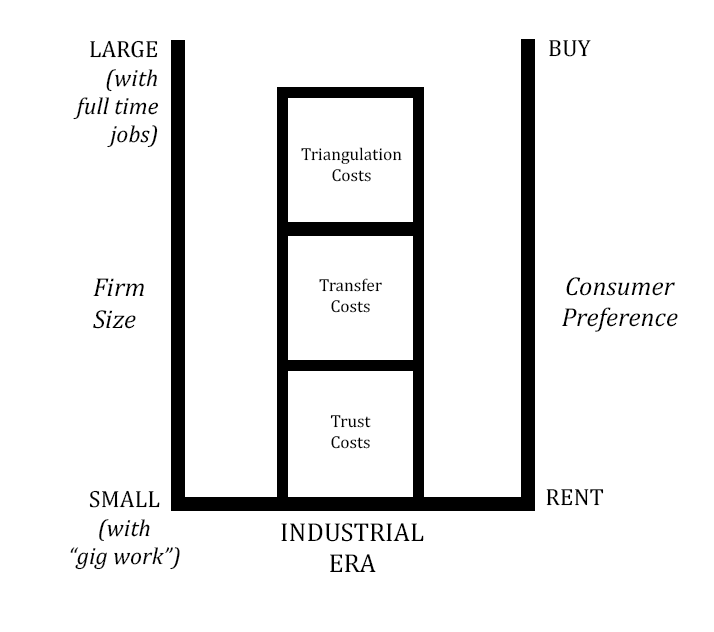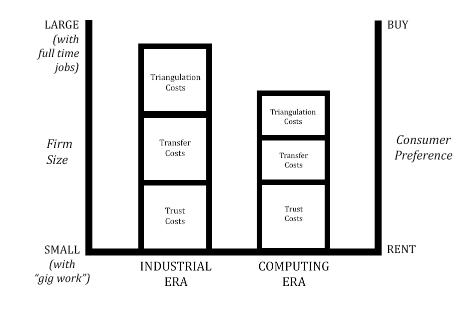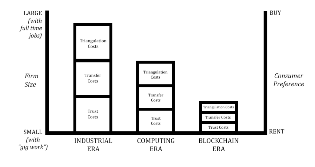 Coming back to Coase, firms will expand or shrink until “making” equals the cost of “buying.” Under this Industrial era, transaction costs made administrative and managerial coordination (making) more efficient than market coordination (buying) for most industries, which led to the rise of large firms.