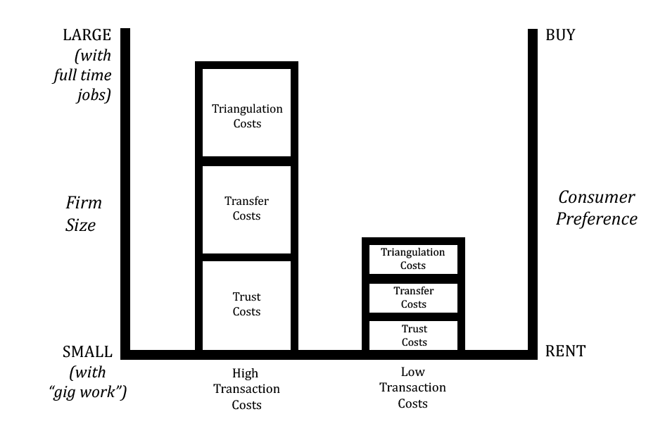 In that world, firms would tend to be large. It would be inefficient to buy things from the market and so entrepreneurs would tend to accumulate large payrolls. Most people would work full-time jobs for large firms. If you wanted to take your family to the beach twice a year, you would need to own the beach house because it would be too inefficient to rent, the reality before online marketplaces like AirBnB showed up.