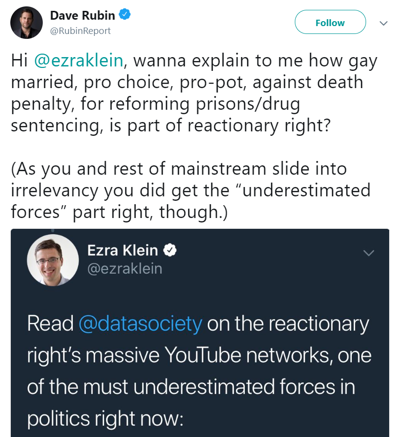 I think Dave Rubin fits well in a category of "reactionaries" for exactly the reasons that Ezra Klein said, and it is sloppiness in articulating it that allows you an opening to make the proposal seem absurd: