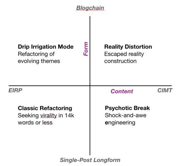 Think of blogchains as an innovation in form to match the retargeted aspirations in content. It is explicit constructionism taken to the level of the container of the text; a form that allows more ambitious constructions. Blogchains are the reinforced concrete of magical thinking.