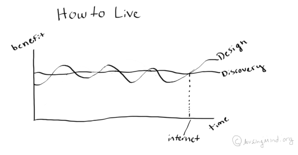 The line of benefit for ‘discovery’ remains constant because I’m not sure engaging with the unknown will ever yield diminishing returns. It is infinite; no matter how much we learn, it’s size remains the same. It remains one of the most vitalizing relations available to the human psyche, and an animating force behind great art. But it is conceivable that, at particular moments in history, the returns on design will outweigh the returns on discovery.