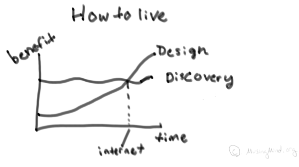 If we zoom out from the graph, we might find that such critical points where the benefits flip from one leg of philosophy to the other are cyclical. That asking how to live is an ongoing, recursive relationship between discovery and design, between finding new answers and embedding those answers into our civilizational systems:
