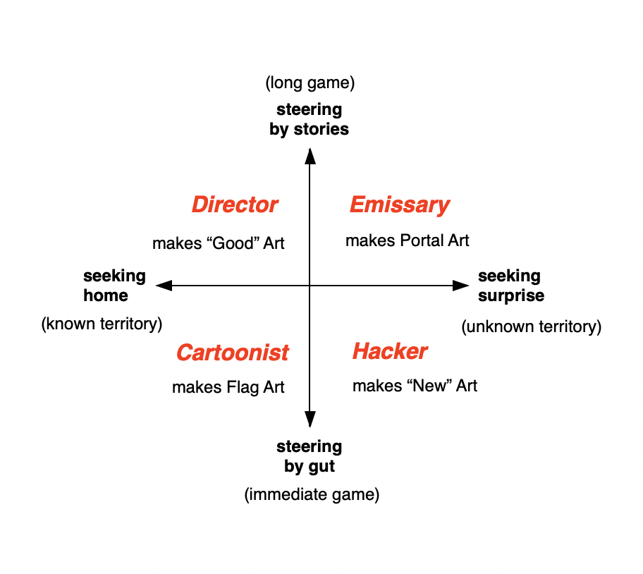 - The Emissary (E) - seeking surprise, steering by story. The conscientious disruptor demon who sees every effort as a step in the continual growth and iterated maintenance of a never-ending story. Sees in terms of living iterations and time scales beyond a human lifespan, protects and aligns core values across efforts, grooms others to be a part of the living story, and accepts its own change as the inevitable adaptation to changes in the wider world. The gardener, shaman, mother, CEO, streamer. If in charge, makes Portal Art.