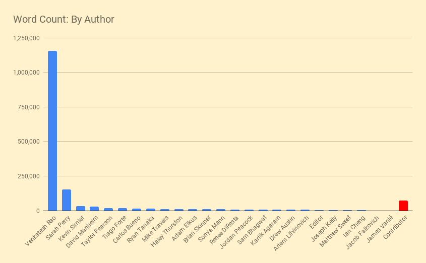 I finally made a proper Contributors page, and after much thought, decided to order it by word count. In the graph below, the red bar is the long-tail-rollup "Contributor" handle under which we publish one-off contributions (it would rank #3 if counted as a single author).