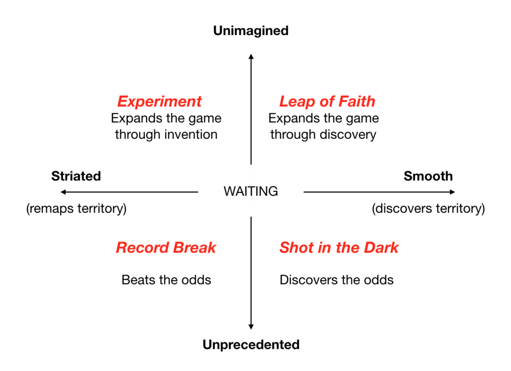 An irreversible action may discover new territory, or remap existing territory. The corresponding irreversible change may either be only in an agent's mind ("One’s mind, once stretched by a new idea, never regains its original dimensions" -- Oliver Wendell Holmes, Sr.) or affect the world itself. The x-axis limits are labeled striated and smooth, following Deleuze-and-Guattari terminology (loosely whether your actions conform to constraints on maps or territories; see Geoff Manaugh on Nakatomi Spaces for a primer).