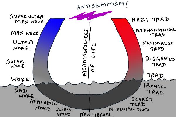 The *meaningfulness* (not 'meaning') of life is highest at both ends of the horseshoe, at which point bolts of shared ideological prejudice flicker back and forth across the poles.