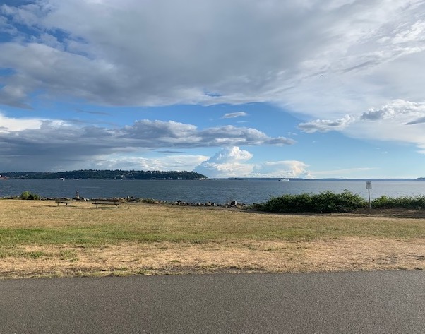 On my last evening here, I went on the same walk I've been on hundreds of time in the last 7 years: from downtown to Myrtle Edwards park and back, along the waterfront. At the point where I usually turn back -- the 1.25 mile mark for a 2.5 mile walk or run -- there is a bench I've often paused at for a few minutes. If my walk is a ritual visit to a headcanon Seattle found temple, that bench is my sanctum sanctorum.