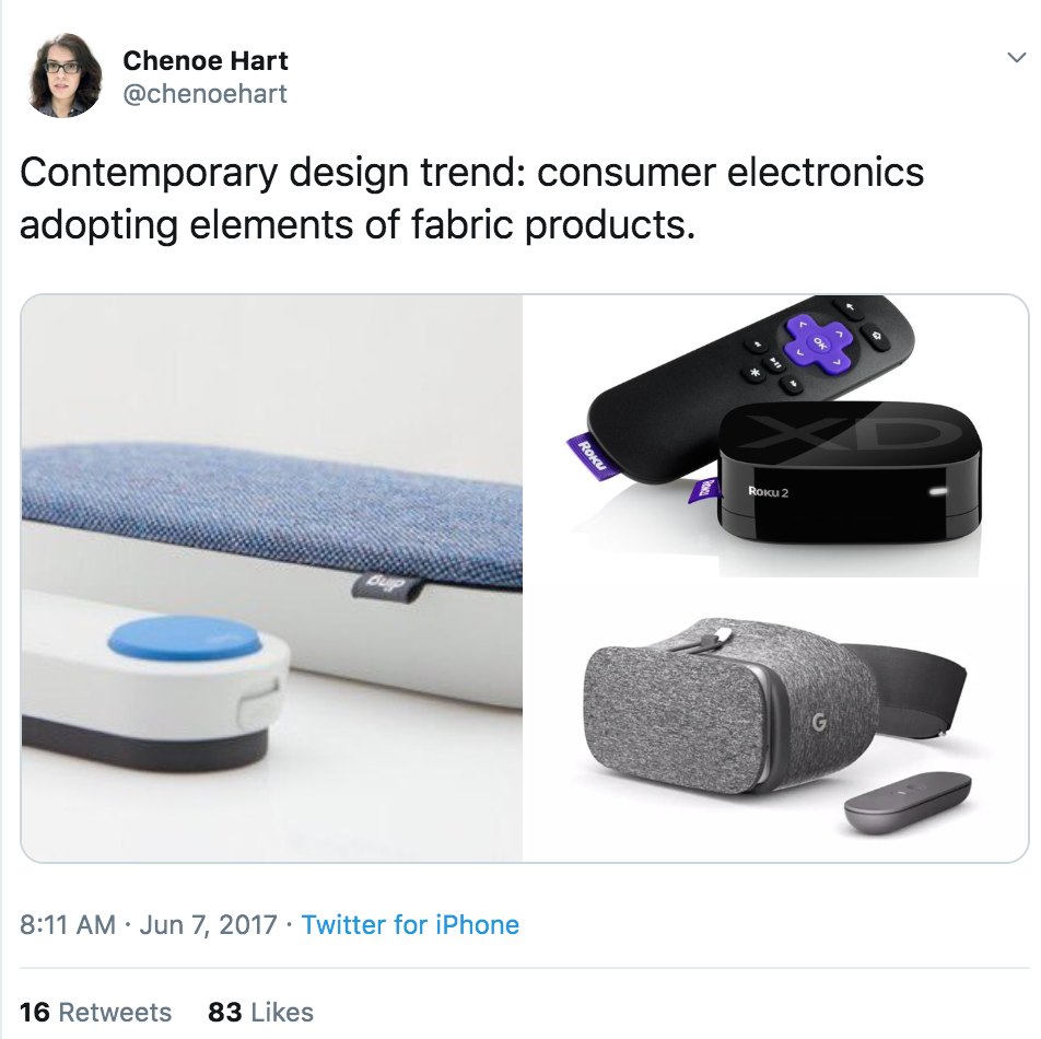 In a related vein, Chenoe Hart recently noted the rise of the use of fabrics and other natural materials in the design of electronic products. This though, seems to be a broader trend intersecting with domestic cozy.