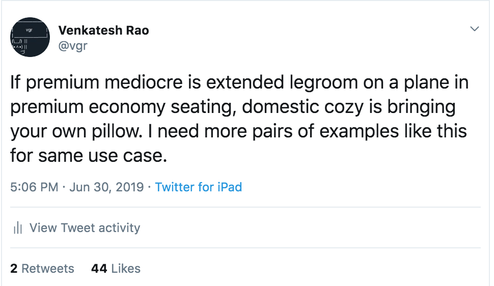 And to round off this vein of twitter-outtake thoughts with one of my own, it struck me that in many situations, domestic cozy adds an element of real comfort to situations where premium mediocre adds an element of theatrical faux-luxury. If premium mediocre is extended legroom on a plane, domestic cozy is bringing your own pillow. I suspect you can make many such apples-to-apples comparisons.